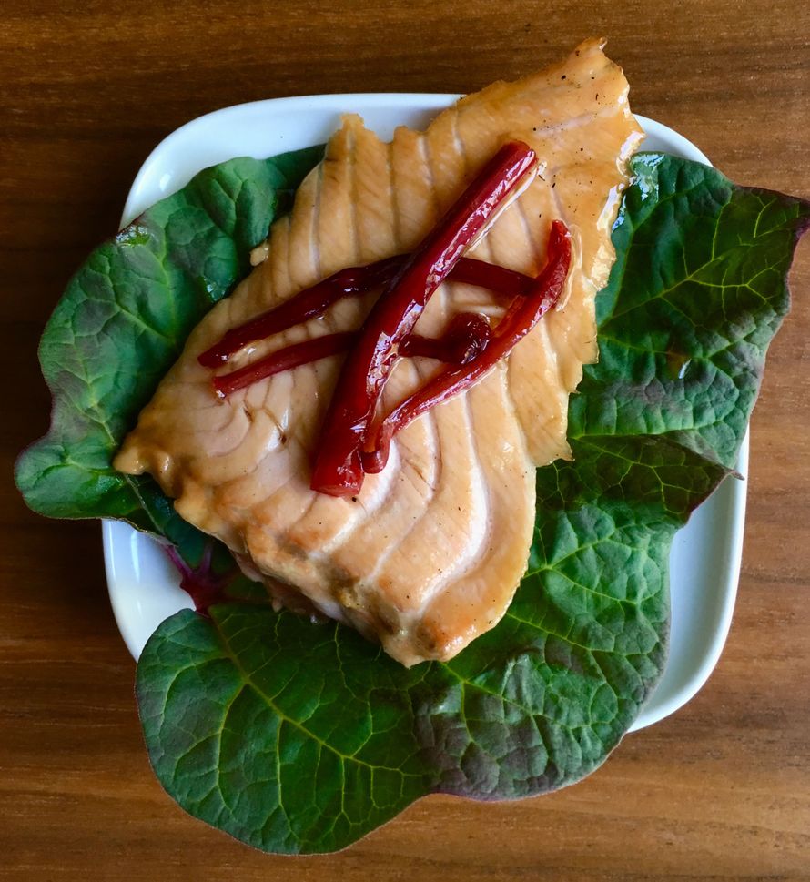 Bravuurini kesäkeittiössä onkin tämä: paistan raparperinvarsia muurikalla tuoreen inkiväärin ja fariinisokerin kanssa ja kumoan herkun juuri paistetun lohen päälle.