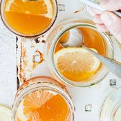 Kuori pois hillon pinnalle noussut vaahto. Purista joukkoon limen mehu ja raasta sekaan inkivääri. Sekoita tasaiseksi.