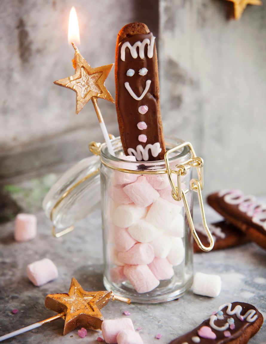 Leivo taikina pipareiksi ja anna jäähtyä. Koristele. Ihana päällinen syntyy esimerkiksi sulasta suklaasta, pikeeristä ja nonparelleista.