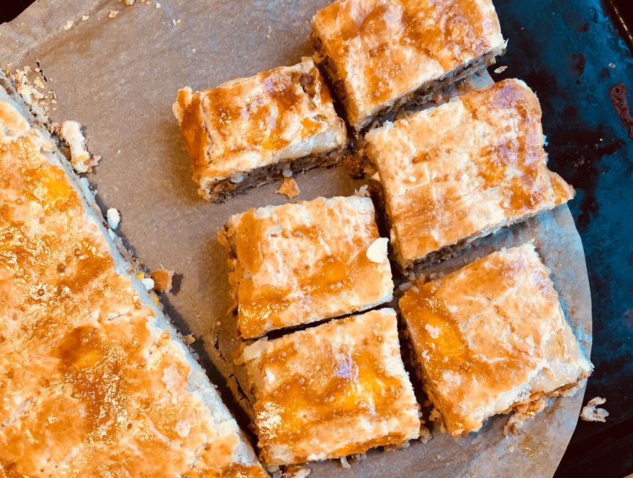 Voitaikinalevyjen sisään leivottu jauhelihariisiseos tuo mieleen lapsuuden. Tein piirakkaa pitkästä aikaa, ja maistuihan se aivan järjettömän hyvältä.