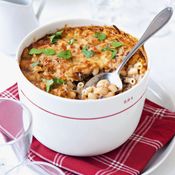 - Paista laatikkoa 175 asteessa 30 min. Nostele makaroneja aina välillä, jotta ne eivät jämähdä vuoan pohjaan. Nosta lämpötila 225 asteeseen, jotta pinta ruskistuu.