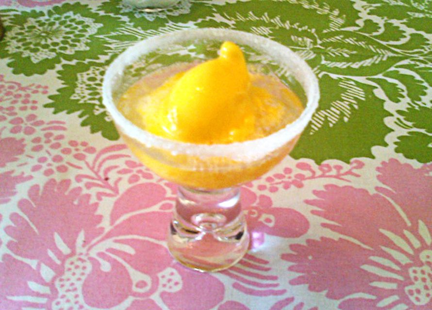 Tässä herkku kaikessa yksinkertaisuudessaan. Kaunis lasi, jonka reunat Elina-emäntä oli kostuttanut valkuaisella. Sen jälkeen reunat oli pyöritelty sokerissa. Lasin pohjalle pallo valmista mangosorbettia ja päälle makeaa kuohuviiniä tai makeaa jälkiruokaviiniä. Tämän helpompaa ei jälkiruuan valmistus voi enää olla.