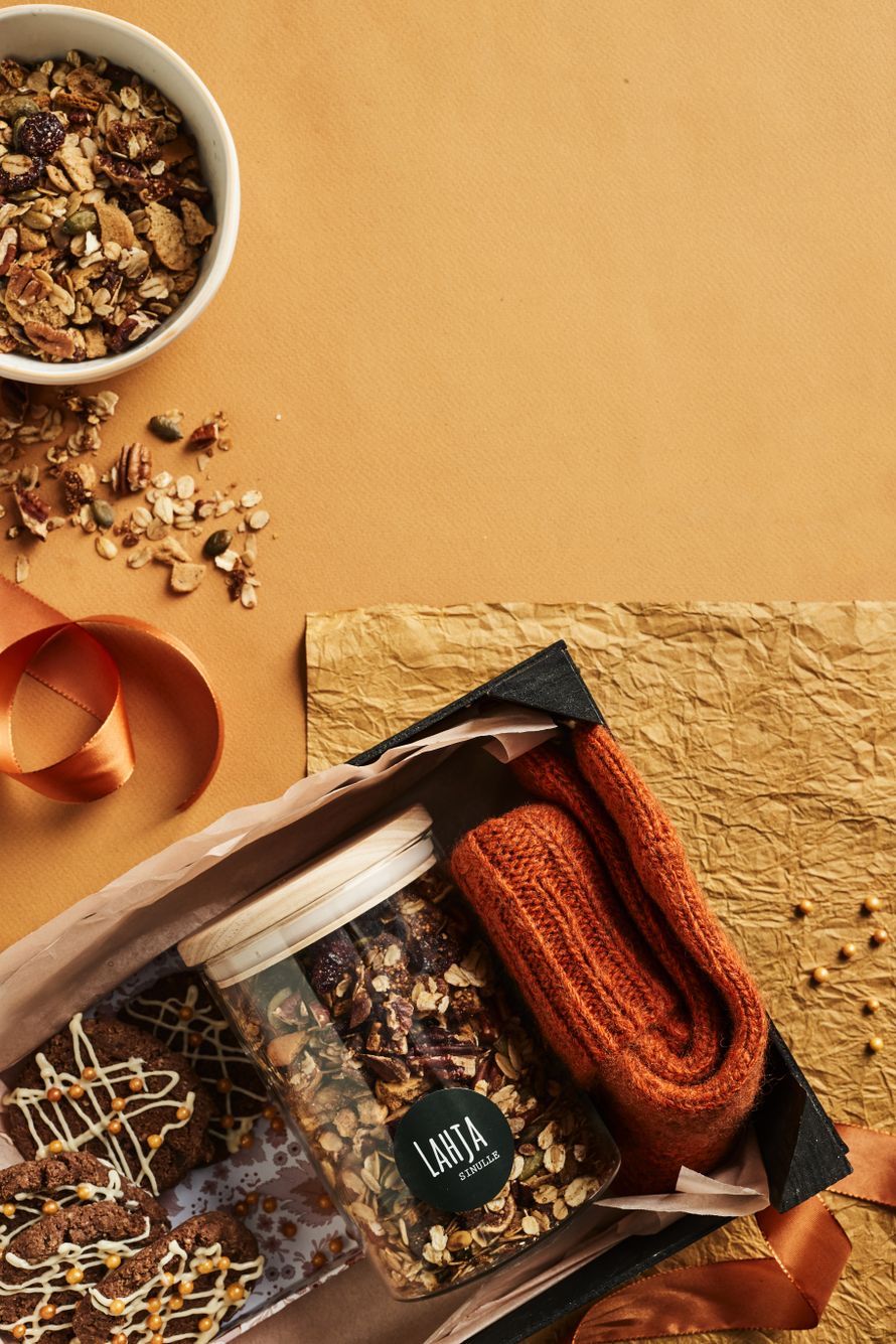 Piparigranolan voi pakata lasipurkkiin ja koota siitä ylellisen aamiaislahjan pieneen puiseen mansikkalaatikkoon yhdessä villasukkien ja suklaakeksien kanssa.