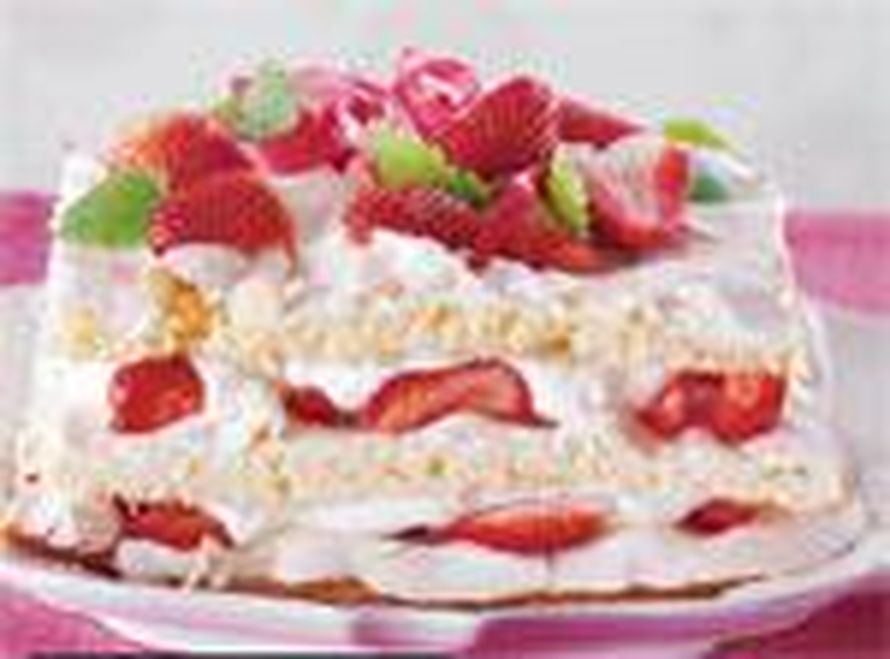 4. Leikkaa kakkupohja kahteen osaan. Levitä toiselle puoliskolle ensin reilusti kermavaahtoa. Pilko mansikoita vaahdon päälle. Nosta toinen kakkulevy päälle ja koristele päällinen mansikoilla. Tarjoa kakku melko nopeasti täyttämisen jälkeen, ettei marenki muutu vetiseksi.