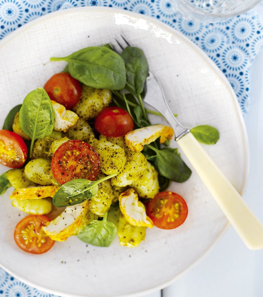 Valuta gnoccheista vesi pois ja sekoita niihin pesto. Voit halutessasi lorauttaa joukkoon hieman oliiviöljyä ohentaaksesi pestoa. Lisää mukaan broilerit, tomaatit ja salaattipinaatti.