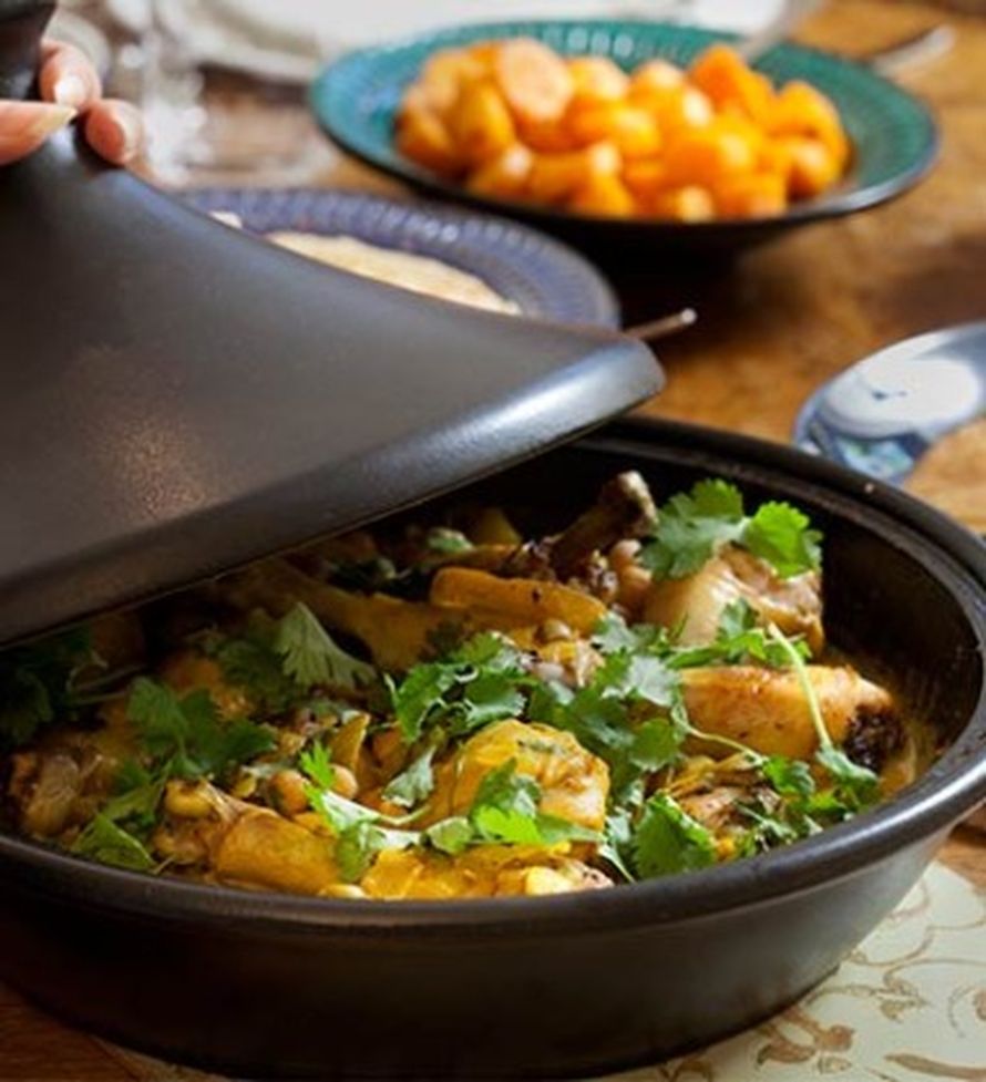 Lisää kikherneet ja anna padan hautua vielä vähintään 20 minuuttia. Koristele yrteillä. Tarjoa kuskusin kanssa.