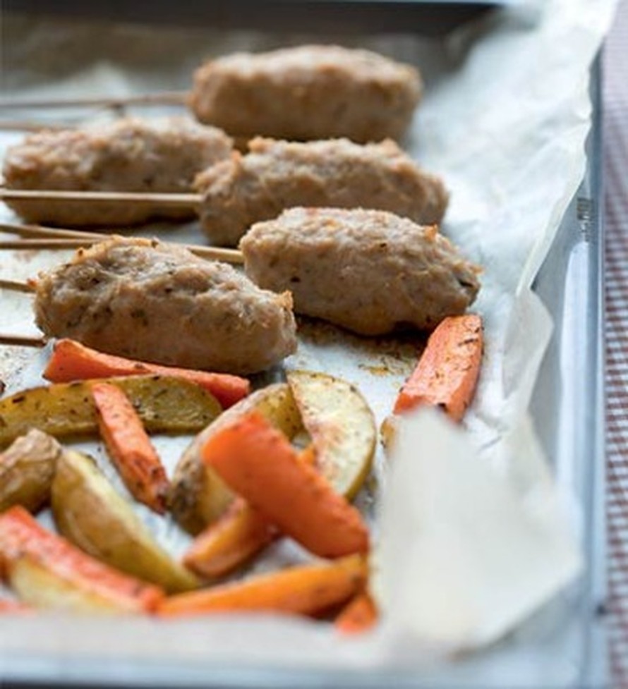 5. Kumoa jauheliha kulhoon. Kuori peruna (sekä halutessasi sipuli) ja raasta hienoksi raasteeksi jauhelihan päälle. Mausta ja sekoita tasaiseksi. Muotoile jauhelihasta kostutetuin käsin 8 pötköä ja työnnä niihin halutessasi puiset varrastikut.