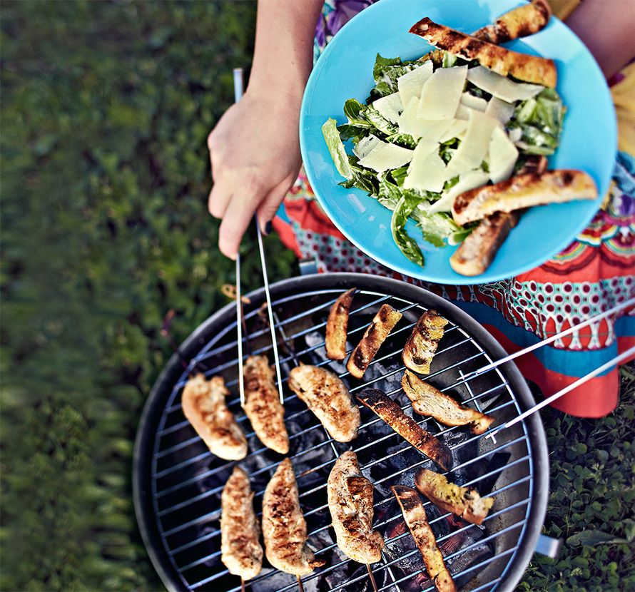 Mausta broileri suolalla, pippurilla ja sitruunan mehulla. Jos käytät rintafilettä, leikkaa fileet pitkittäin kahteen osaan. Laita broileri grillitikkuihin. Voitele oliiviöljyllä.
