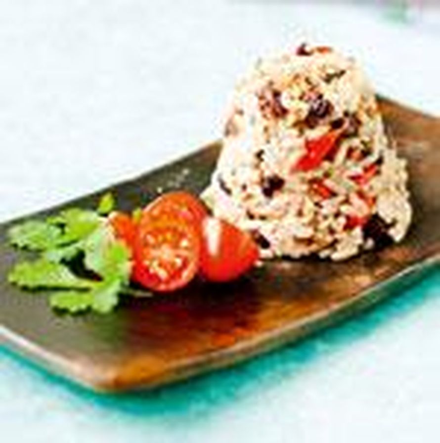 2. Kuumenna pekoni pannulla, kunnes siitä alkaa irrota rasvaa tai kuumenna öljy. Kuullota sipulit ja paprika rasvassa. Lisää pavut ja jatka kuullottamista pari minuuttia. Kääntele sekaan riisit ja paista noin 3 minuuttia. Mausta korianterilla ja tabascolla.