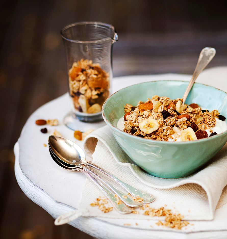 Makea ja rapea paahdettu mysli eli granola on loistava alku aamulle.