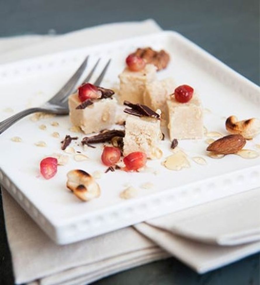 Paahda pähkinät kuumalla, kuivalla pannulla. Paloittele tarjoilukulhoon tai annoslautasille halvaa ja jäätelöä. Vuole päälle suklaalastuja esimerkiksi kuorimaveitsellä. Valuta päälle hunajaa ja koristele jälkiruoka granaattiomenan siemenillä. Tarjoa minttuteen kanssa.