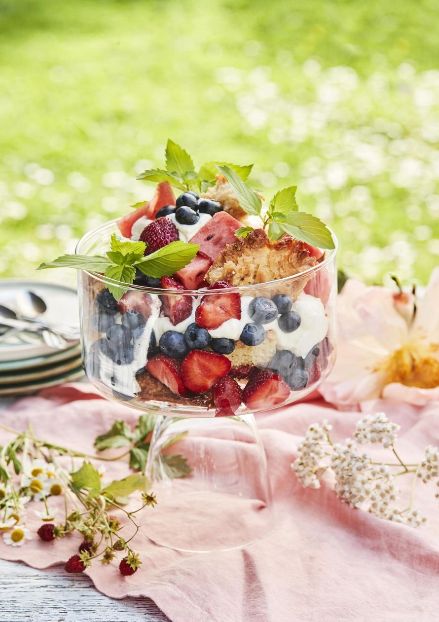Juhannuspöydän kruunaa näyttävä ja leikkisä toscatrifle, joka syntyy toscapiirakan paloista, kuohkeasta kermavaahdosta, vesimelonikuutioista ja tuoreista mansikoista ja mustikoista. Valmista ensin pellillinen mehevää toscapiirakkaa, nauti puolet siitä kahvin kanssa sellaisenaan ja pyöräytä lopuista toscatrifle. Piirakka säilyy kylmässä viikon.