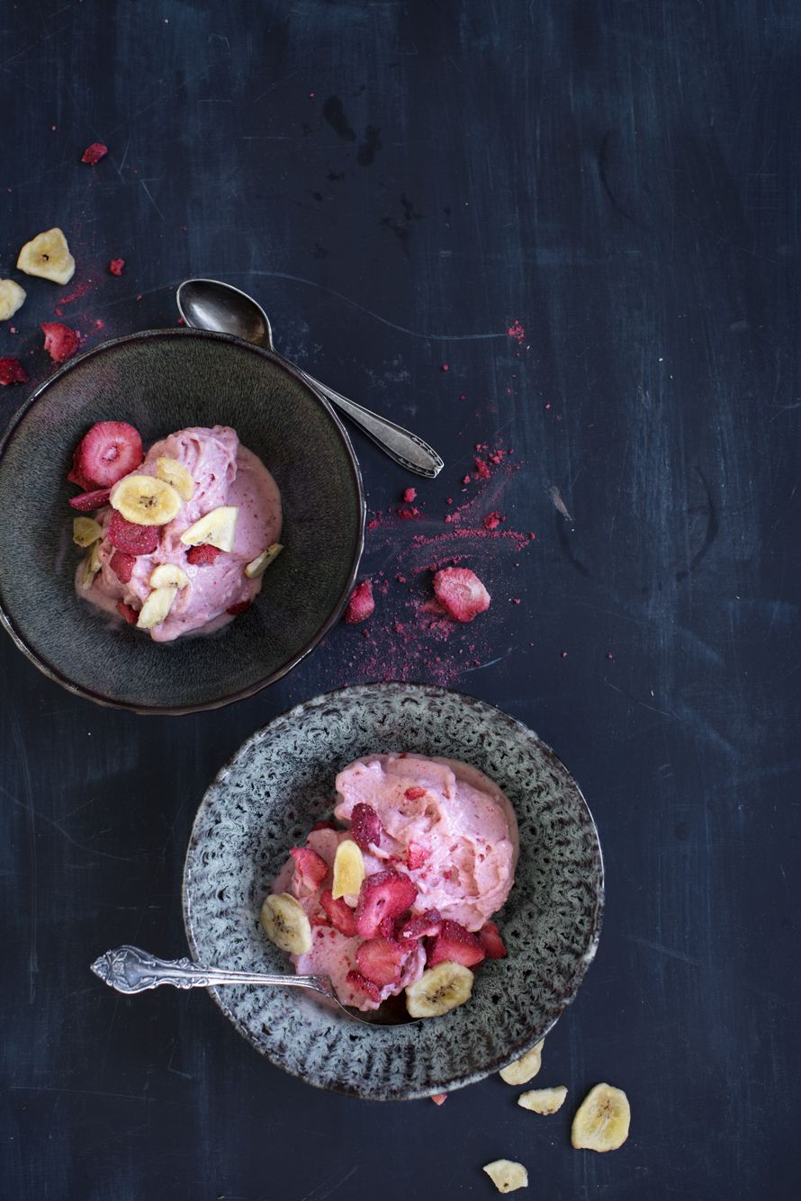 Tummuneita banaaneja hedelmäkorissa, mikä ihana tekosyy! Pyöräytä banaanit, pakastemansikat ja jugurtti ihanaksi pehmojätskiksi.