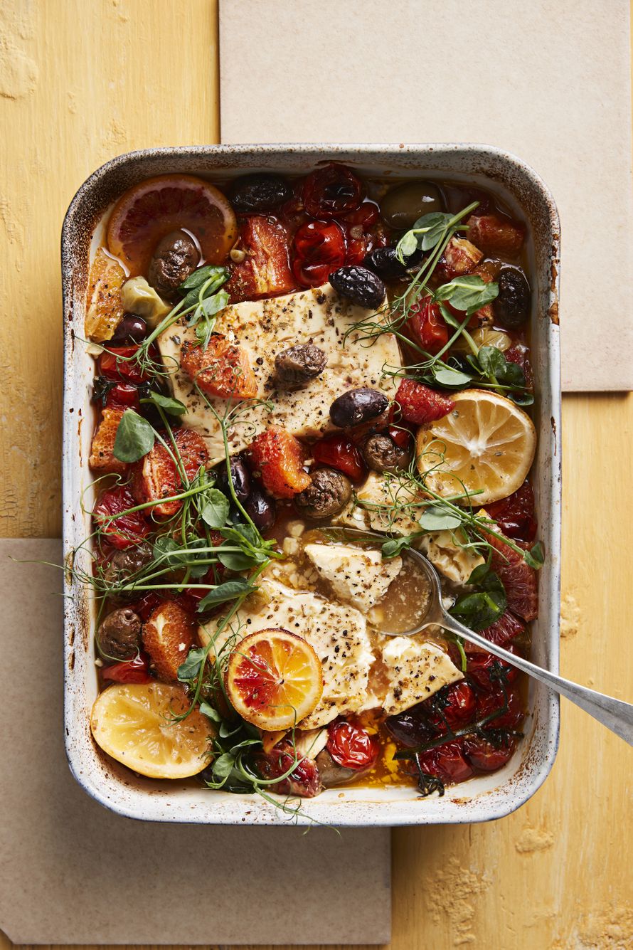 Helppo uunifeta on ylivoimainen arjen sujuvoittaja. Tässä maukkaassa versiossa tomaattien seuraan liittyvät veriappelsiinit ja oliivit.