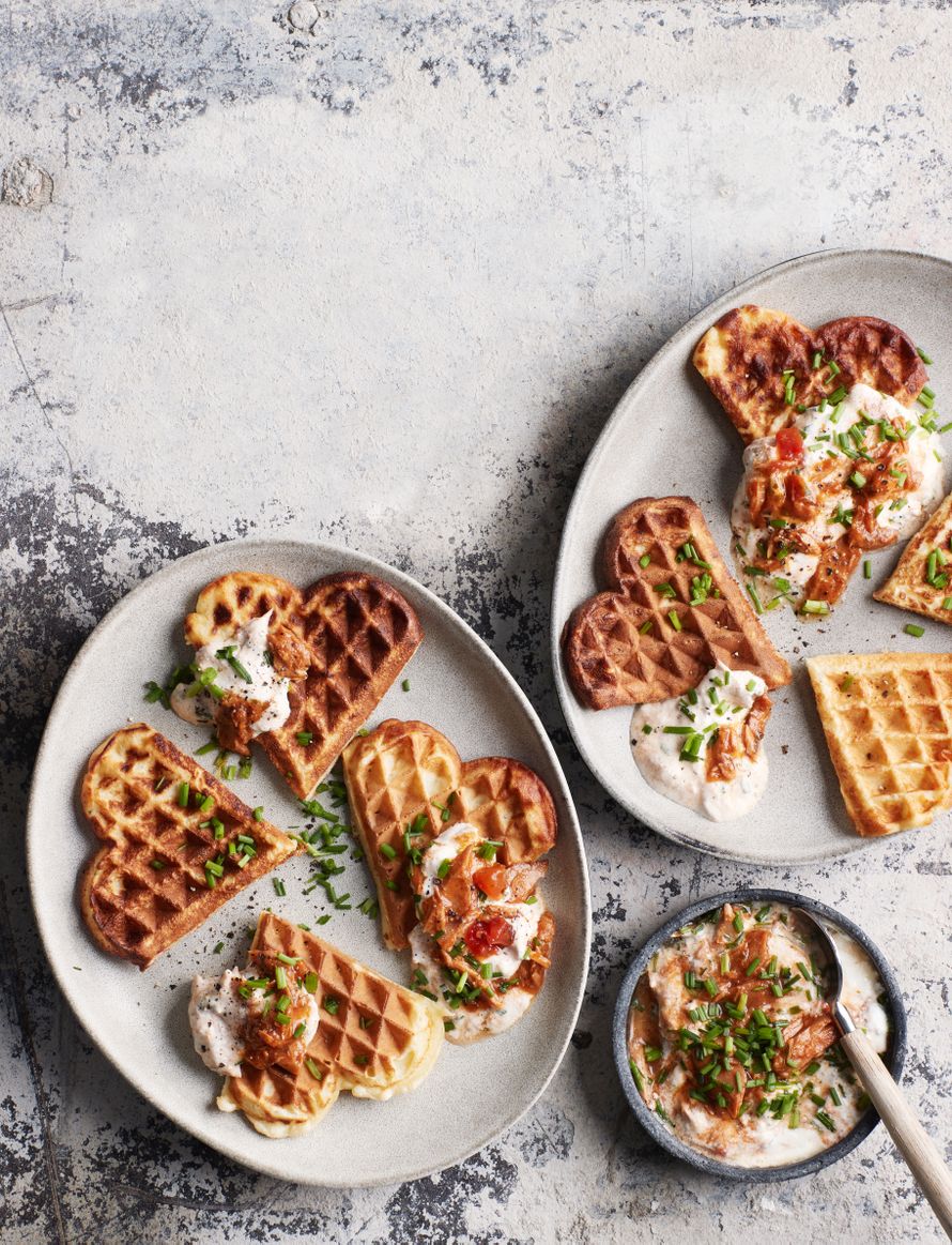 Paista taikinasta vohvelit. Sivele vohveliraudan paistopinnat öljyllä. Tarjoa vohvelit tonnikalatäytteen kanssa.