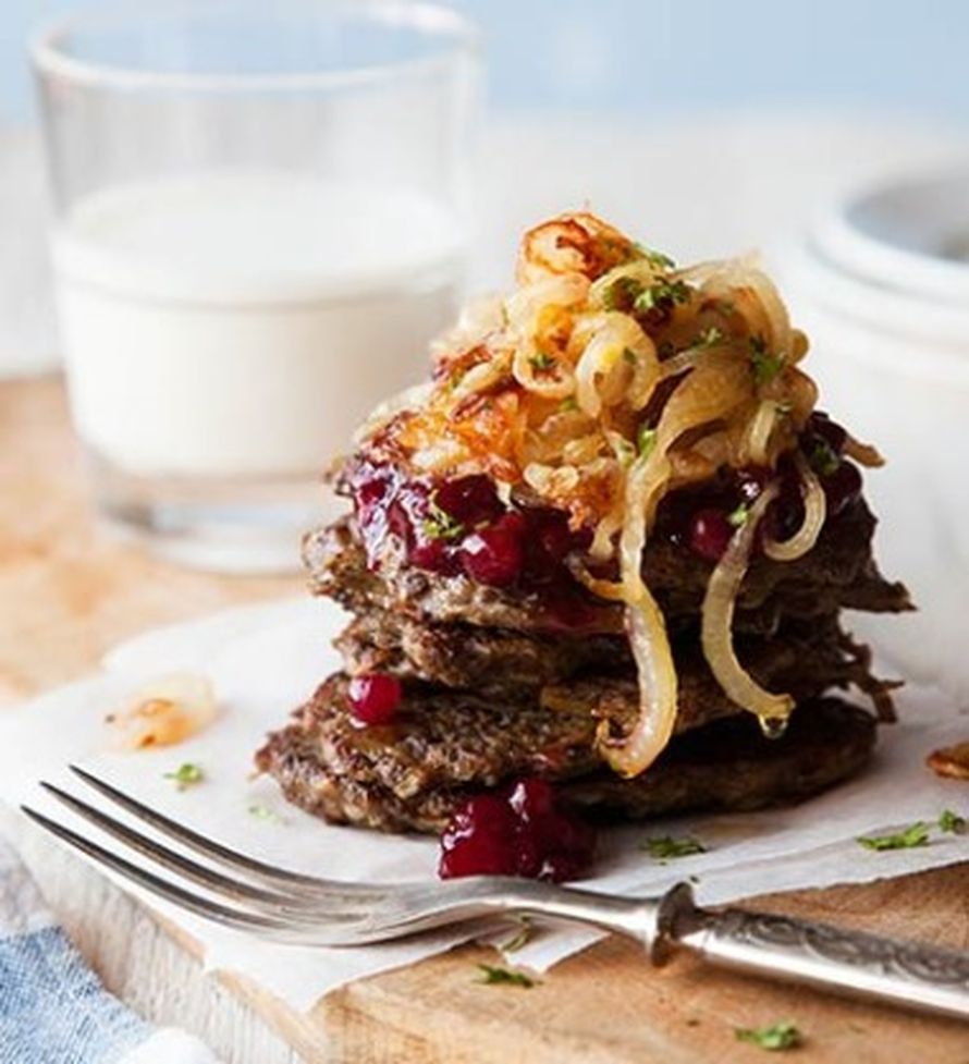 Nosta paistetut sipulirenkaat jauhemaksapihvien päälle. Tarjoa pihvit perunamuusin ja puolukoiden kanssa.