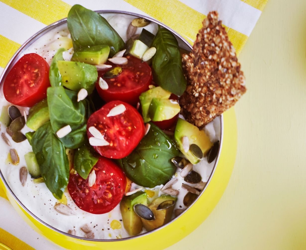 Pilko jugurtin päälle kasa avokadoa, tomaattia ja kurkkua. Revi päälle hieman basilikaa tai korianteria. Ripottele viimeiseksi siemeniä.