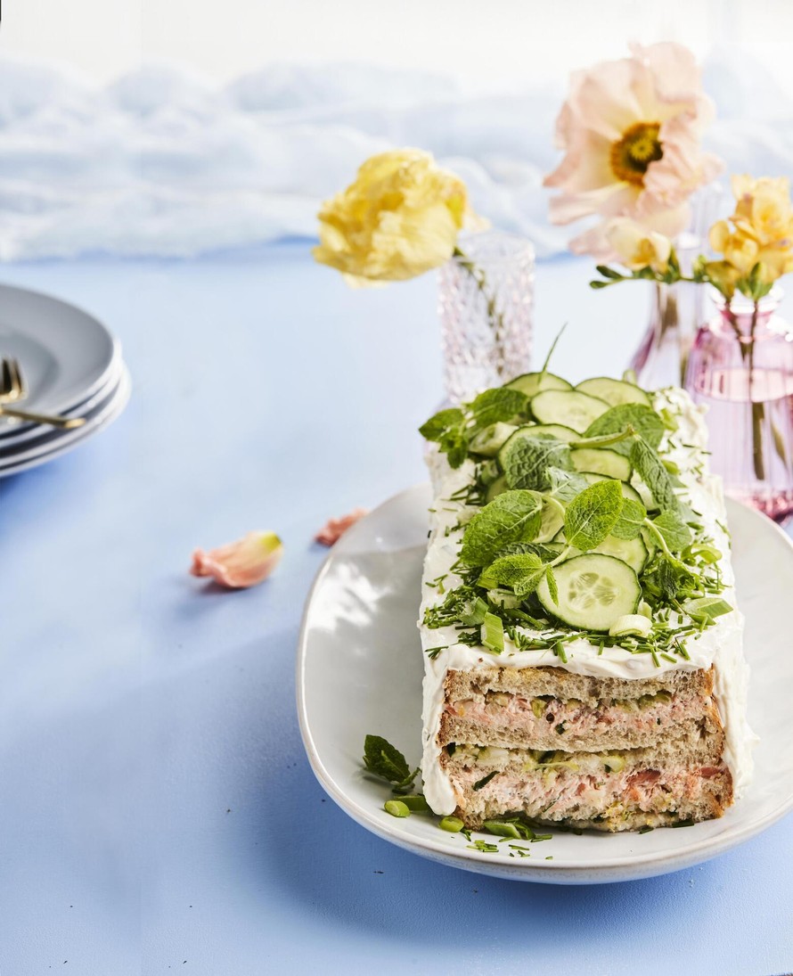 Herkullisen voileipäkakun kerroksissa on pikkelöityä kurkkua, fenkolia ja täyteläistä savulohta.