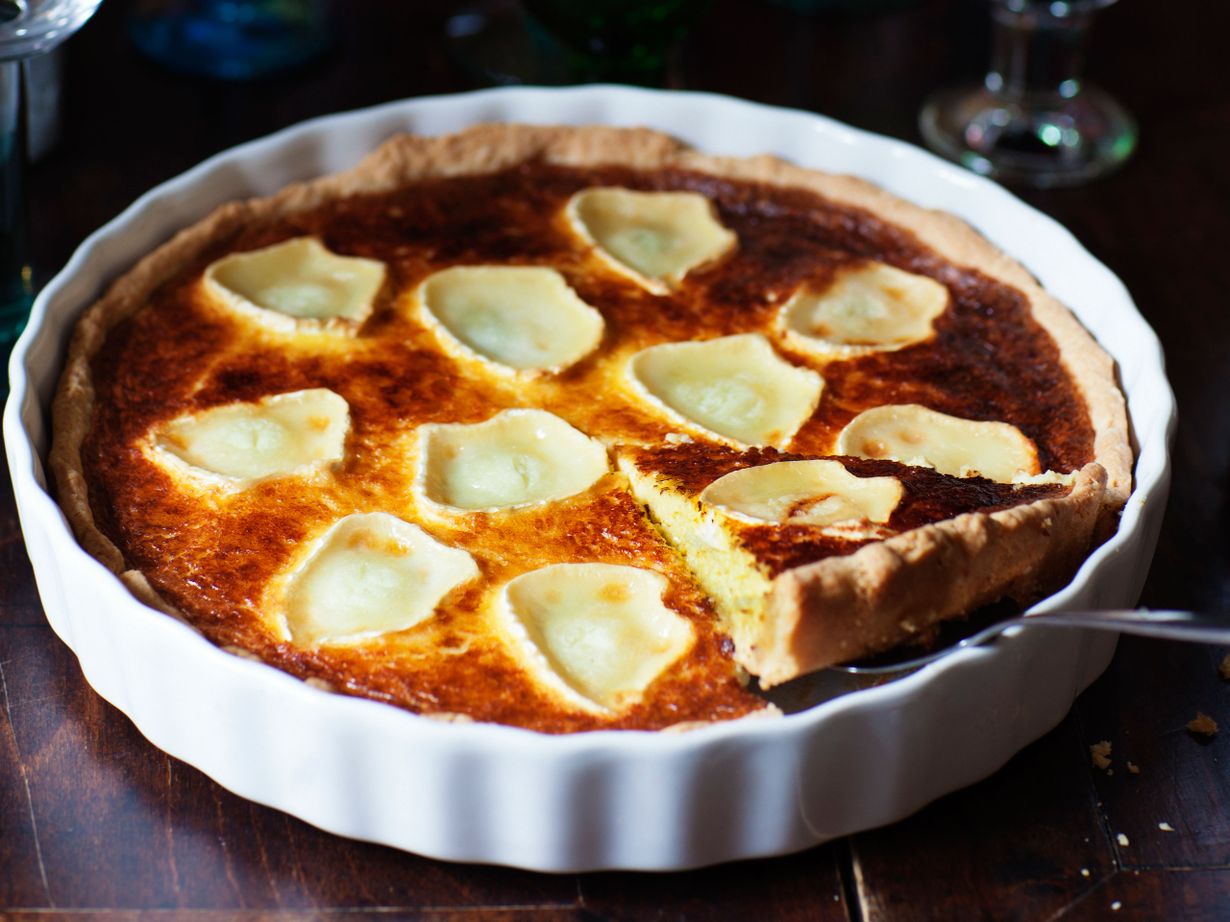 Vuohenjuustokiekot pilkuttavat piirakan.