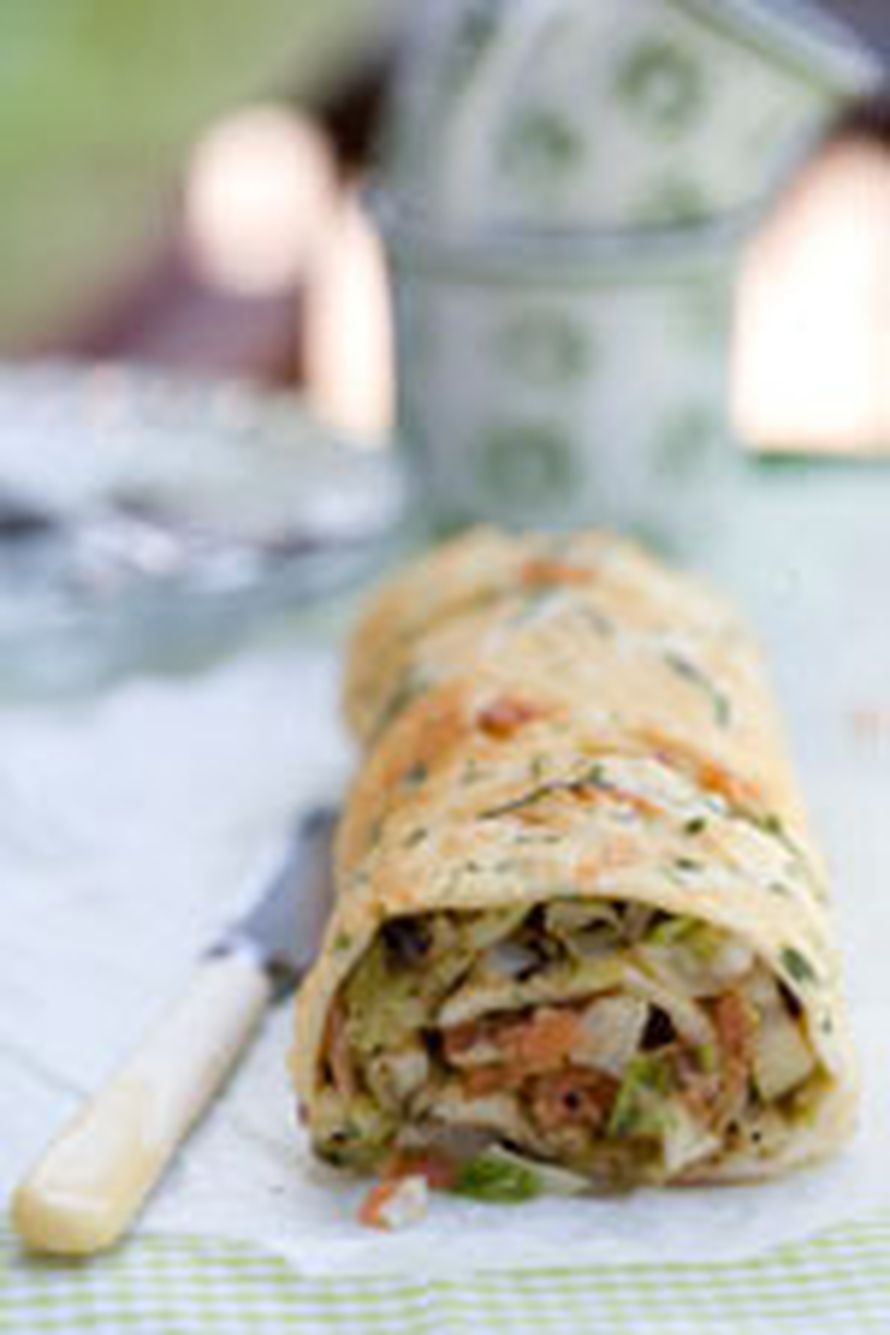 4. Nostele valutettua täytettä munakkaan pinnalle ja kääri munakaspohja leivinpaperia apuna käyttäen tiukahkolle rullalle. Jätä liitoskohta rullan alle. Leikkaa paloiksi ja tarjoa viileänä.