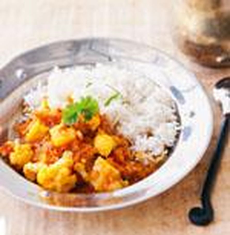 3. Kuumenna öljy pannulla, lisää kumina ja sinapinsiemenet. Kuullota noin minuutti.  Lisää maustetahna ja kiehauta. Laita sekaan kasvikset ja kypsennä sekoitellen, kunnes kasvikset ovat puolikypsiä. Lisää vettä sen verran että saat kastikemaisen seoksen ja anna hautua, kunnes kasvikset ovat kypsiä. Koristele tarkari tuoreella, silputulla korianterilla. Tarjoile riisin kanssa.