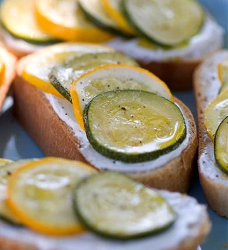 1. Leikkaa kesäkurpitsat ohuiksi viipaleiksi. Sekoita sitruunamehu vuohenjuustoon. Levitä juustoa leipäviipaleille. Asettele kesäkurpitsaviipaleita leipien päälle. Voitele pinta kevyesti oliiviöljyllä. Ripottele pinnalle suolaa ja pippuria maun mukaan.