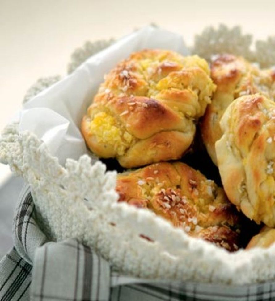 5. Leikkaa levy noin kolmen sentin paksuisiksi suikaleiksi. Käännä suikaleita muutaman kerran spiraaliksi ja kiedo solmuun. Nosta leivinpaperin päälle uunipellille. Anna kohota leivinliinan alla noin 20 minuuttia.