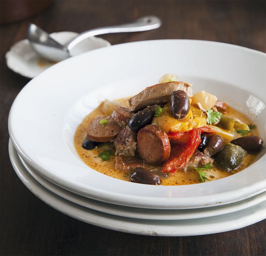 Ruskista lihat ja makkarat valurautapadassa tai isossa paistokasarissa. Lisää paprikapalat ja suurusta ruoka ripottelemalla päälle jauhoja. Lisää kerma ja anna ruuan porista 10 minuuttia.
