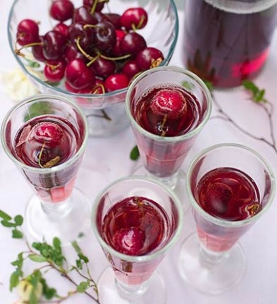 Pane kuohuviinilasien pohjalle tuore kirsikka. Täytä lasit vajaaseen puoliväliin kirsikkaväkeväviinillä. Kaada päälle viilennettyä kivennäisvettä juuri ennen tarjoilua.