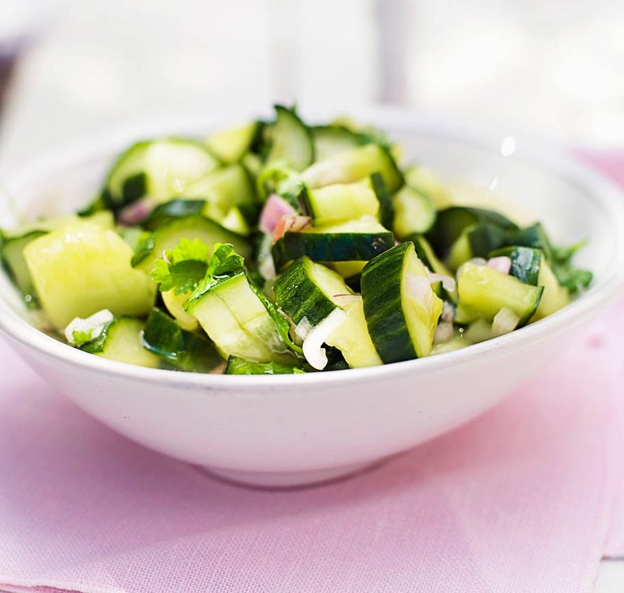 1. Leikkaa kurkku pituussuunnassa neljään osaan. Pilko palat pieniksi kuutioiksi tarjoiluastiaan. Kuori ja silppua sipulit. Sekoita kurkkupalojen joukkoon.