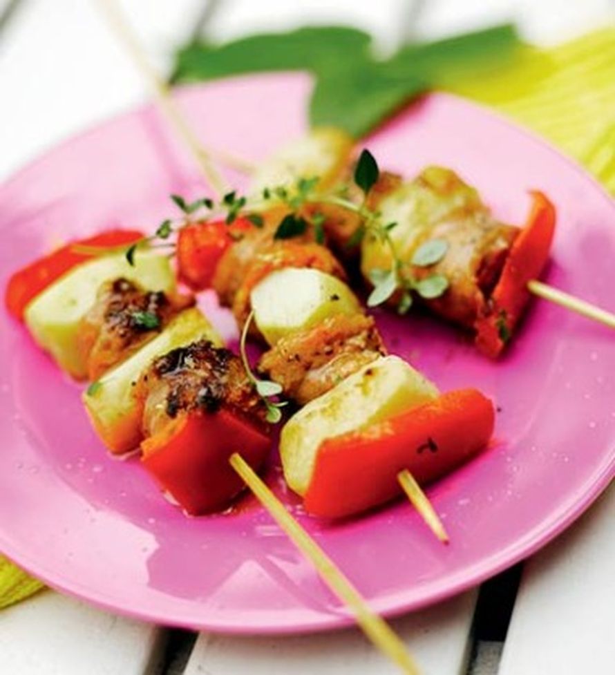 3. Sivele vartaita timjamiöljyllä. Grillaa vartaat kypsiksi tasaisesti käännellen. Tarjoa vartaiden kanssa feta-jogurttidippiä.