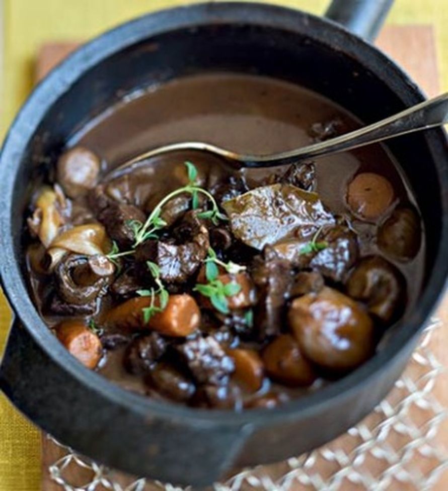 1. Leikkaa liha 2 cm x 2 cm kuutioiksi. Kuori ja paloittele porkkanat reiluiksi paloiksi. Kuori sipulit ja jätä niihin kanta, jotta sipulit säilyvät kokonaisina. Leikkaa suuremmat sipulit kahteen osaa ja jätä pienemmät kokonaisiksi. Puhdista herkkusienet.