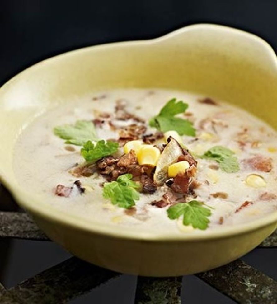 3. Kuori perunat ja suikaloi ne pieniksi. Lisää perunat, maito, vesi, liemikuutiot sekä loput maissista. Keitä hiljalleen noin 15 minuuttia, kunnes perunat ja maissi ovat kypsiä. Mausta makealla chilikastikkeella ja rouhitulla mustapippurilla. Lisää tarvittaessa suolaa.