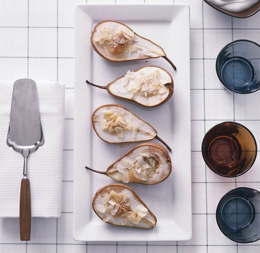 Pese ja halkaise päärynät. Koverra lusikalla siemenkodat. Sivele päärynöiden leikkuupinnat sitruunamehulla.