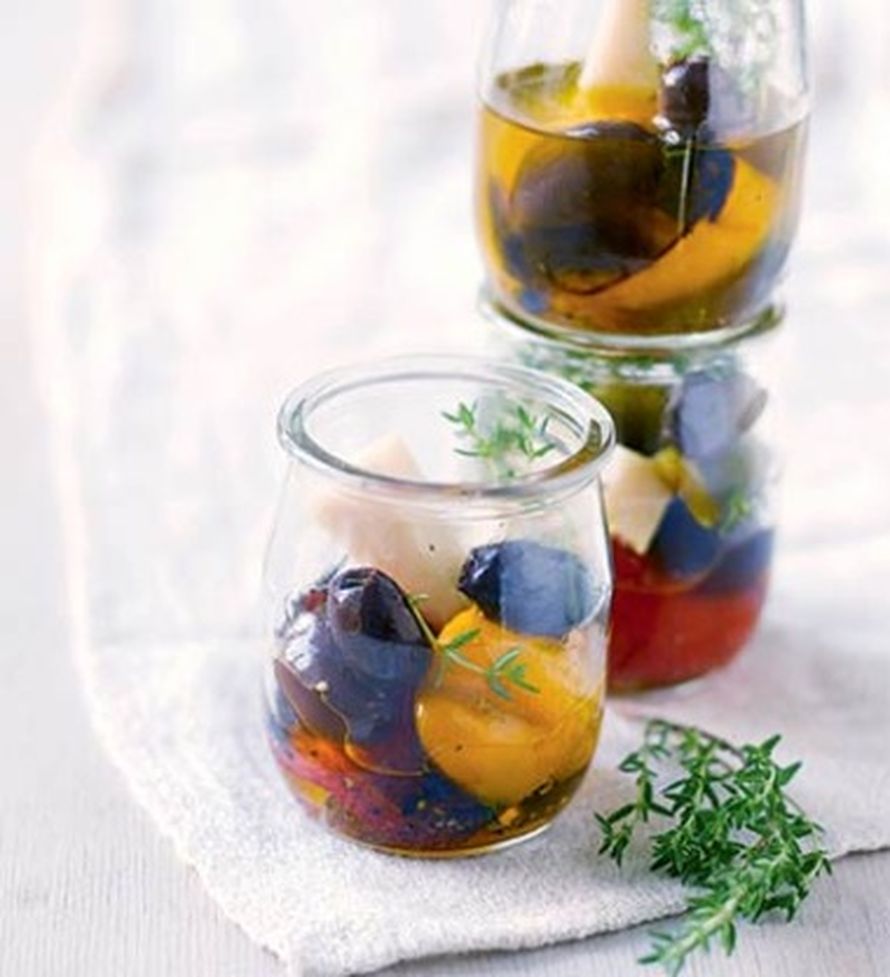 2. Sekoita öljy, balsamico, pippurit ja yrtit. Kaada seos juusto–kasvisseokseen. Nosta jääkaappiin ja anna maustua vähintään vuorokausi.