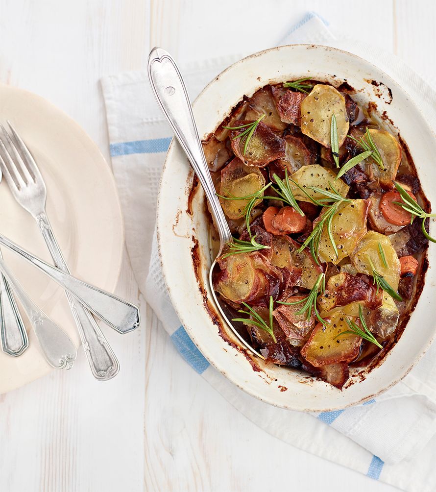 Lado voideltuun uunivuokaan kerroksittain perunaa, juureksia, lihaa ja sipulia. Laita päällimmäiseksi kerrokseksi perunoita.