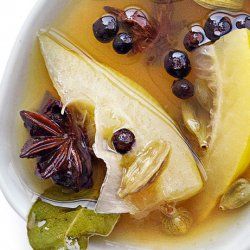 Pese ja lohko sitruuna. Mittaa kaikki ainekset kattilaan. Anna kiehua miedolla lämmöllä noin viisi minuuttia. Jäähdytä. Käytä sitruunalientä broilerin tai possun marinointiin.