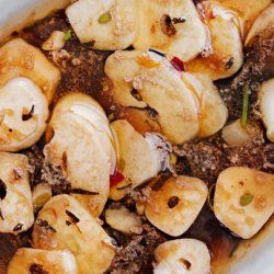 Lisää valkosipulit ja anna niiden kiehua öljyssä vain noin 15 sekuntia. Lisää etikka ja savusuola. Sekoita ja jäähdytä. Käytä marinadia naudan- ja lampaanlihan maustamiseen.