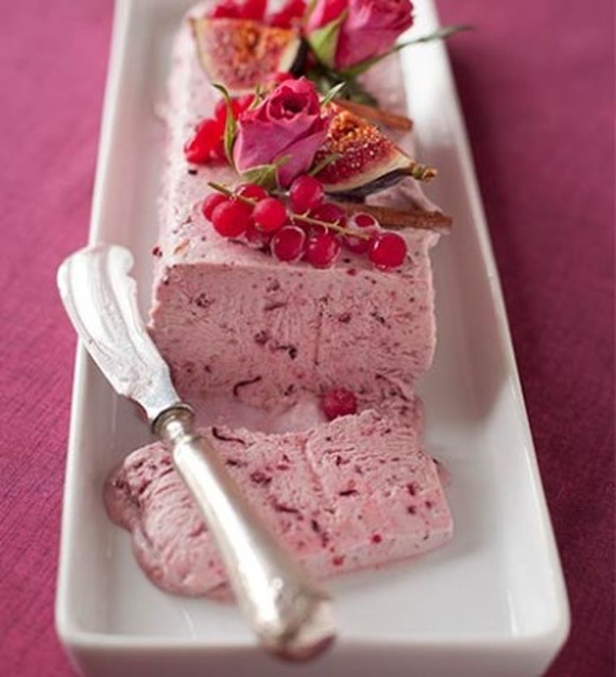2. Soseuta sulaneet mustaherukat. Yhdistä kaikki aineet varovasti. Tarkista maku ja lisää halutessasi sokeria. Kaada massa pitkulaiseen kasteltuun vuokaan. Peitä ja nosta pakastimeen jäätymään vähintään yön yli.
