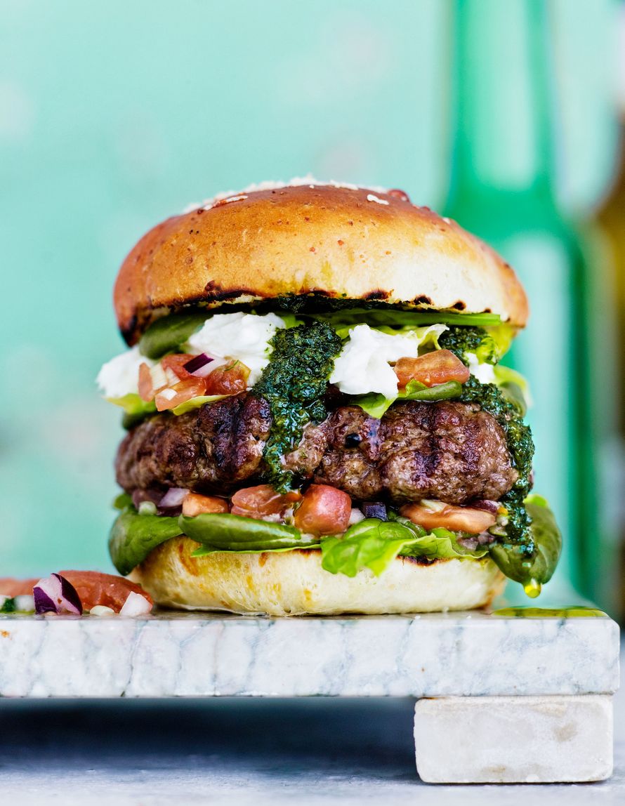 Täydellinen burgeri: Parmesaanisämpylä. Mehevä ja tuhti jauhelihapihvi. Itse tehty tomaattisalsa ja raikas persiljapesto. Ei lisättävää. Tämä on kesän paras hampurilainen.
