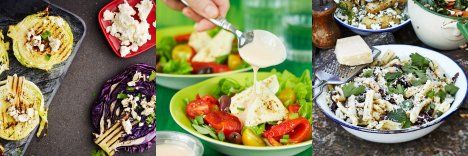 Varhaiskaali-fetakiekot: Varhaiskaalin maku syvenee, kun siihen grillaa vauhtiraidat. Murustele päälle vielä fetaa, niin edessäsi on mehevä kasvisruoka.Grillattu paprika-fetasalaatti ja raparperivinegretti: Raparperi kelpaa piirakan lisäksi myös maustamaan salaatinkastiketta. Ihana paprikasalaatti on väriensä ansiosta pöydän katseenvangitsija.