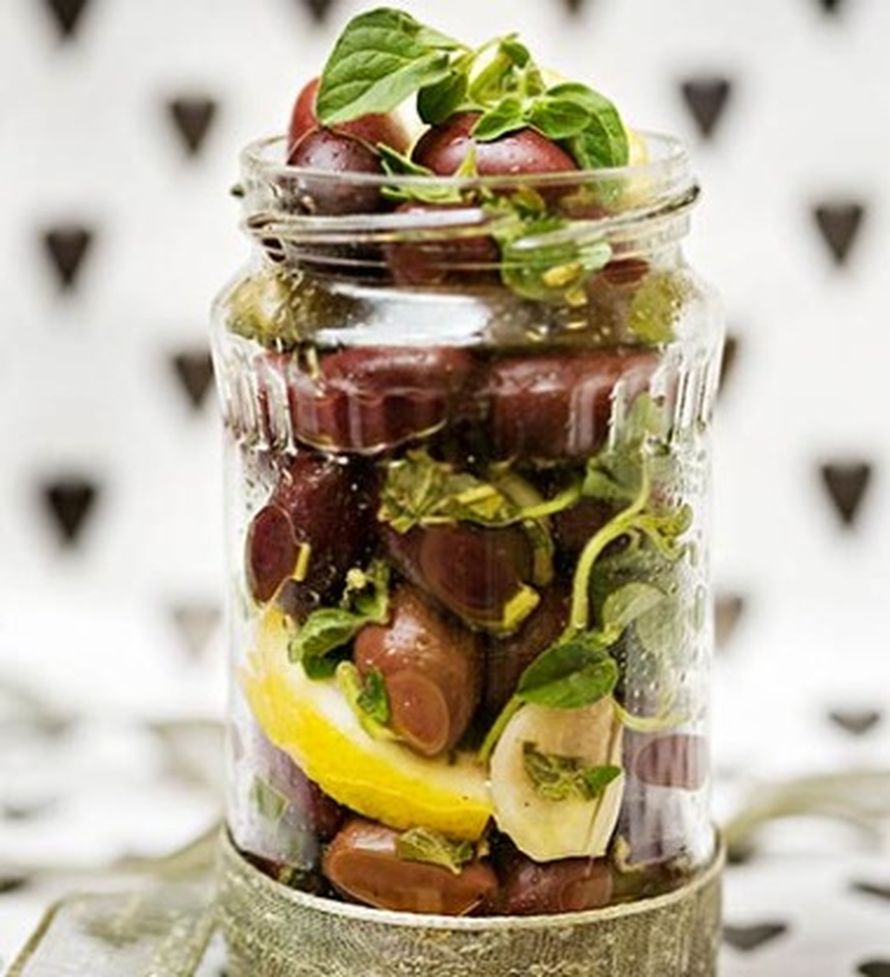Paloittele valkosipuli. Jätä se reiluiksi siivuiksi tai lohkoiksi ja lisää oliivien joukkoon. Leikkaa mukaan myös sitruunaviipaleita. Kaada oliivit sievään purkkiin ja anna makujen tekeytyä vähintään vuorokausi ennen nautiskelua.