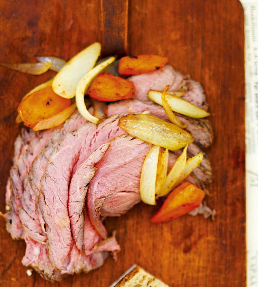 Kääräise paahtopaisti alumiinifolioon vetäytymään 15 minuutiksi. Leikkaa liha terävällä veitsellä mahdollisimman ohuiksi viipaleiksi. Tarjoa paahtopaistin kanssa voissa paistettuja sipuleita ja porkkanoita sekä mustaherukkahyytelöä.