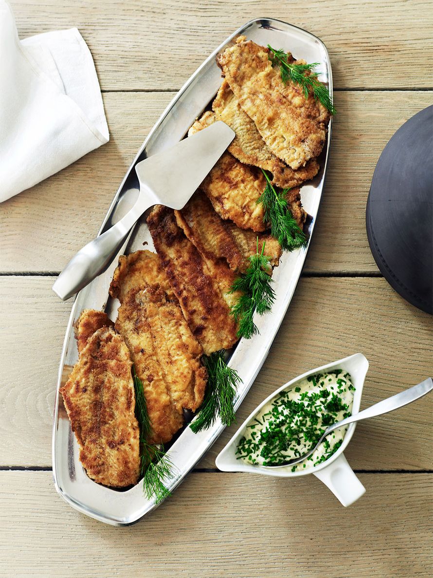 3. Leivitä marinoituneet kampelat korppujauho-vehnäjauhoseoksessa, johon on lisätty ripaus suolaa, ellei sitä ole marinadissa.