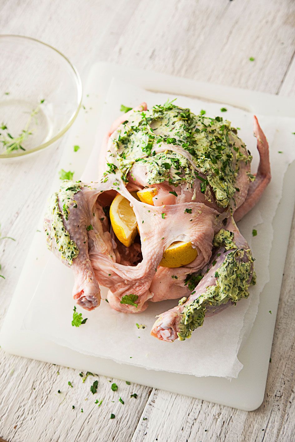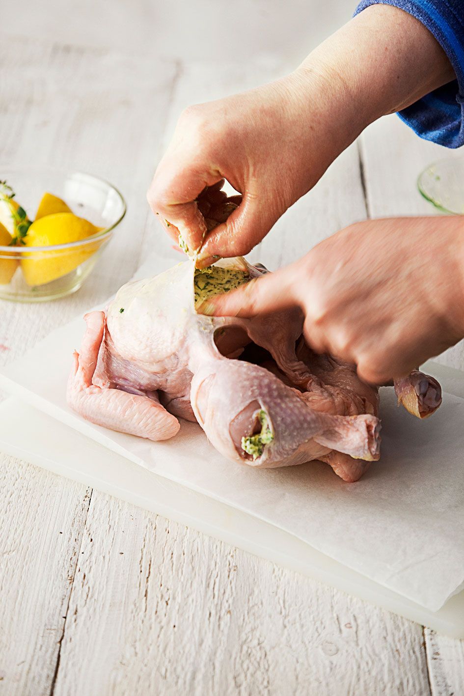 Leikkaa broilerin nahkaan viilto. Hiero reilu puolet yrttiseoksesta nahan alle.