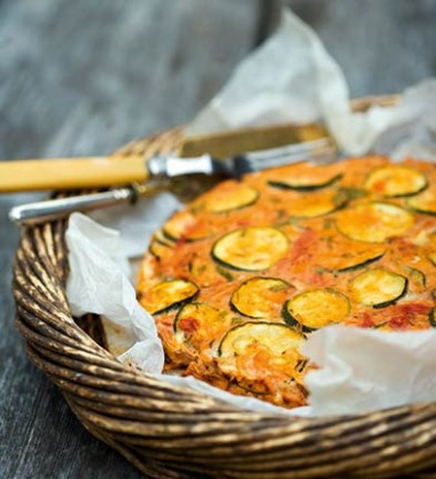 3. Riko munien rakenne ja lisää sekaan juustoraaste, persilja ja ruohosipuli sekä lopuksi tomaattimuhennos. Lisää kesäkurpitsasiivut ja tarkista maku.
