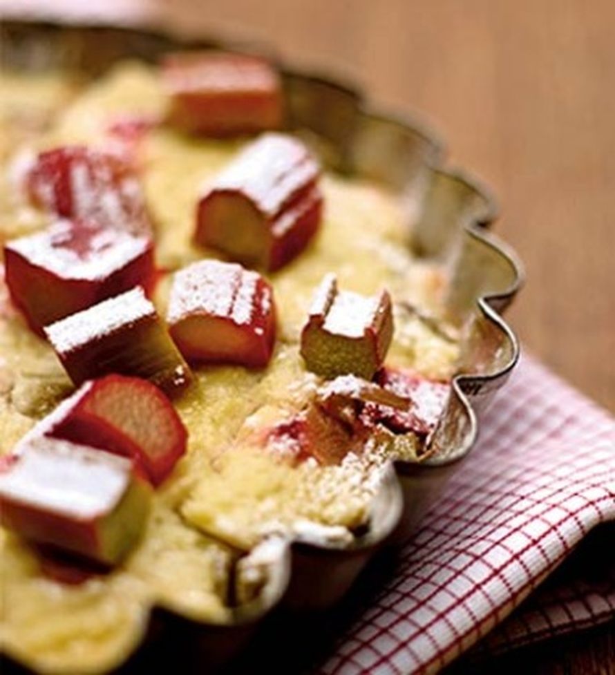 Kaada päälle vaniljakiisseli ja tasoita pinta. Ripottele pinnalle raparperikuutiot.