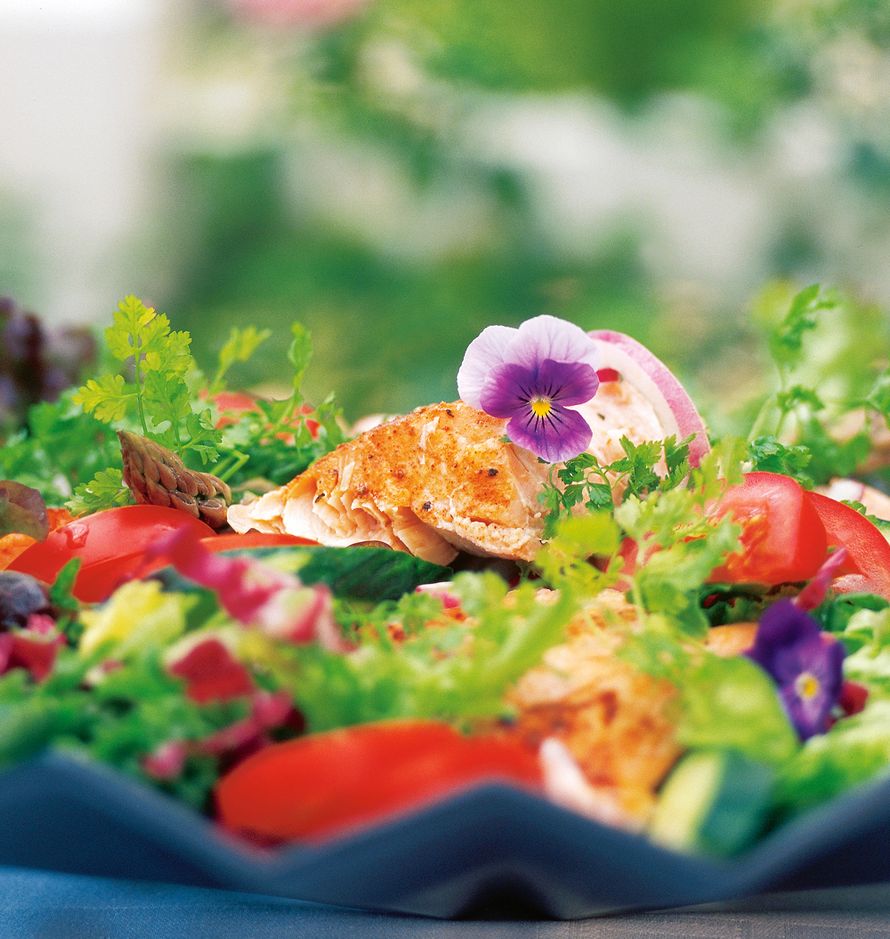 Nosta salaatti tarjoiluvadille ja asettele savukalaa päälle. Koristele syötävillä orvokeilla tai muilla kukilla.