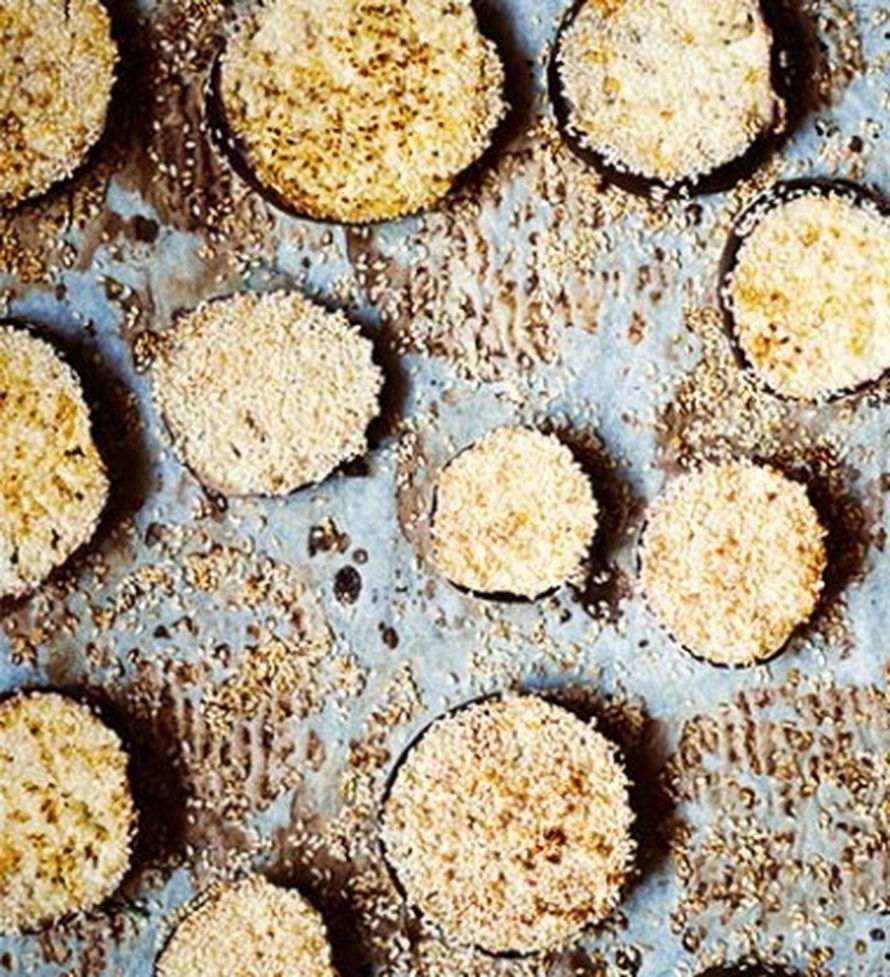 2. Painele seesaminsiemenet kiekkojen pintaan molemmin puolin. Paista pannulla kasviöljyssä tai kuumassa uunissa (250°C) molemmin puolin, kunnes siemenet saavat kauniin ruskean värin.
