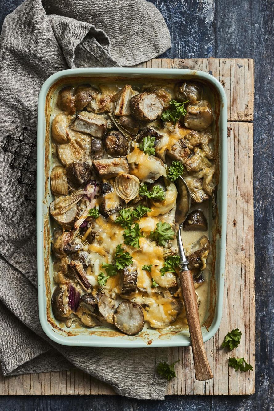 Sieltä ne taas saapuvat, syksyn satokauden antimet! Testaa koukuttavan hyvää maa-artisokkapaistosta, joka on kuorrutettu juustoraastekerroksella. Paistoksen tekemiseen menee vain reilu vartti, jonka jälkeen mukulat kypsyvät uunissa tunnin. Saat vuoasta myös helposti vegaanisen, kun vaihdat ruokakerman kaurakermaan ja juustoraasteen vegaaniseen juustoon.
